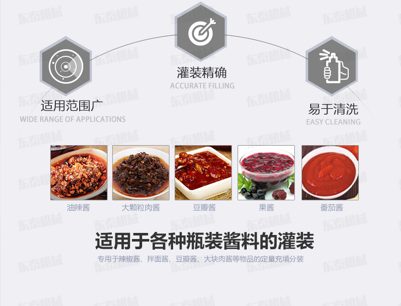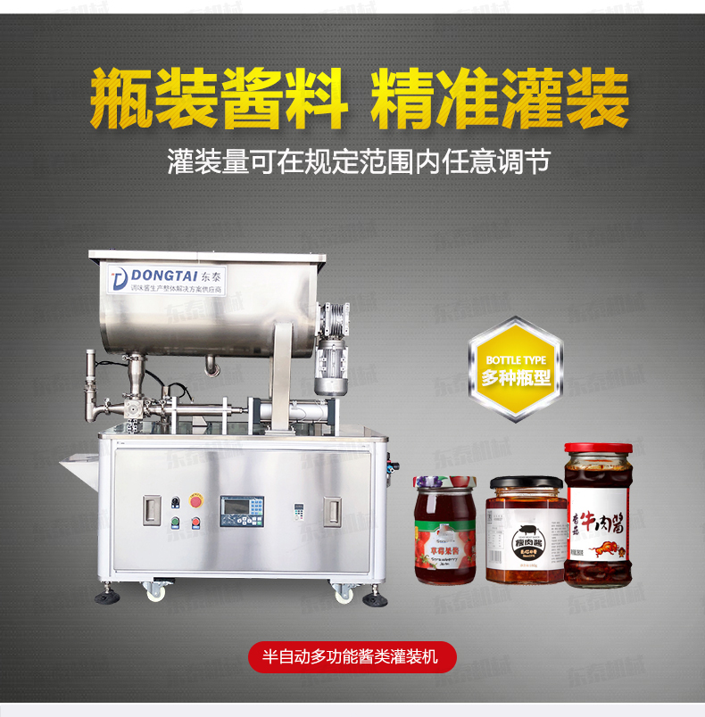 這款辣椒醬灌裝機(jī)是我公司結(jié)合自身十幾年的生產(chǎn)經(jīng)驗(yàn),加之灌裝機(jī)技術(shù),進(jìn)行設(shè)計(jì)的產(chǎn)品,其結(jié)構(gòu)更加簡(jiǎn)單、操作更加簡(jiǎn)便。小型辣椒醬灌裝機(jī)可灌裝顆粒漿狀流體物料,特別適用于調(diào)味品中帶顆粒并且濃度較大的辣椒醬、火鍋底料等粘稠醬類的灌裝,配置的自動(dòng)攪拌器,保證了醬和油的充分混合,又稱為辣椒醬灌裝機(jī)、花生醬灌裝機(jī)、豆瓣醬灌裝機(jī)、果醬灌裝機(jī),芝麻醬灌裝機(jī)、粘稠醬類灌裝機(jī)、牛肉醬灌裝機(jī)
