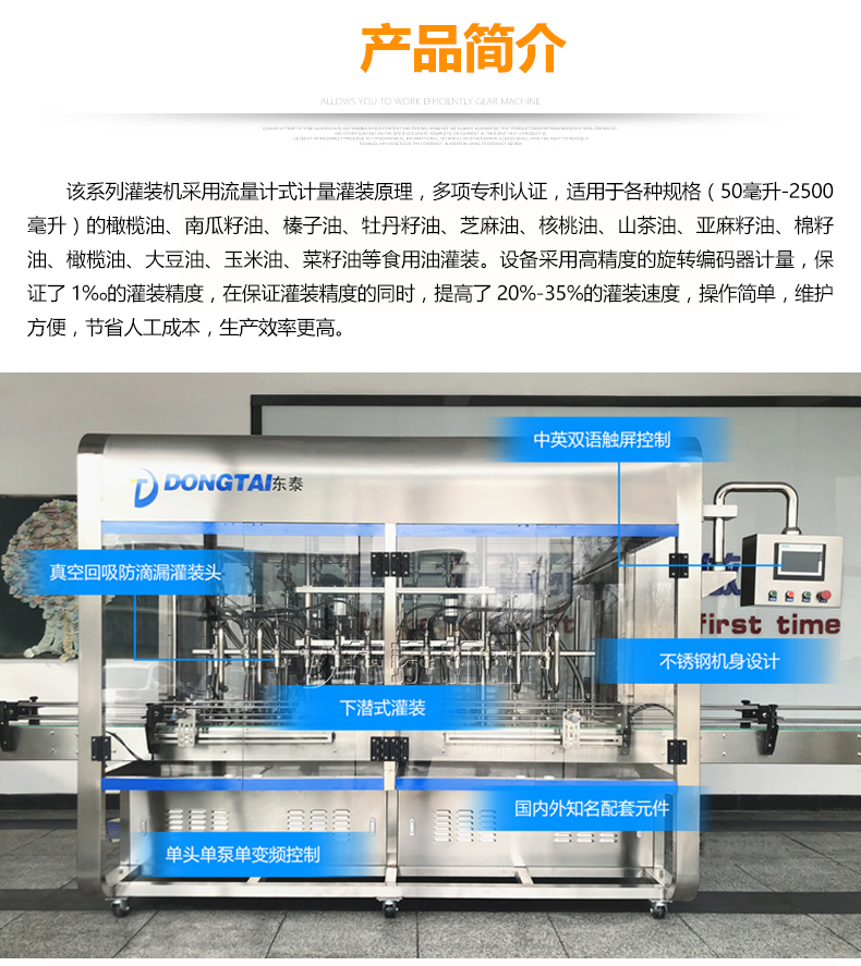 這款食用油灌裝機應(yīng)用的是流量計式計量灌裝的原理,榮獲了多項認證資格,可適用各種容量(1-5升)的南瓜籽油、榛子油、牡丹籽油、芝麻油、核桃油、山茶油、亞麻籽油、棉籽油、橄欖油、大豆油、玉米油、菜籽油等多種食用油的灌裝。這個食用油選用了高精的旋轉(zhuǎn)編碼器計量,使灌裝精度保持在了1%o,在保證樂灌裝誤差的同時,提高了20%-35%的灌裝速率,使用方便,維護便捷,減少了一部分的人工成本,使生產(chǎn)效率提升。除了進桶時間,6頭灌裝機,變頻器在25赫茲的速率進行下,每組灌裝的時間為16秒,1350桶/小時;